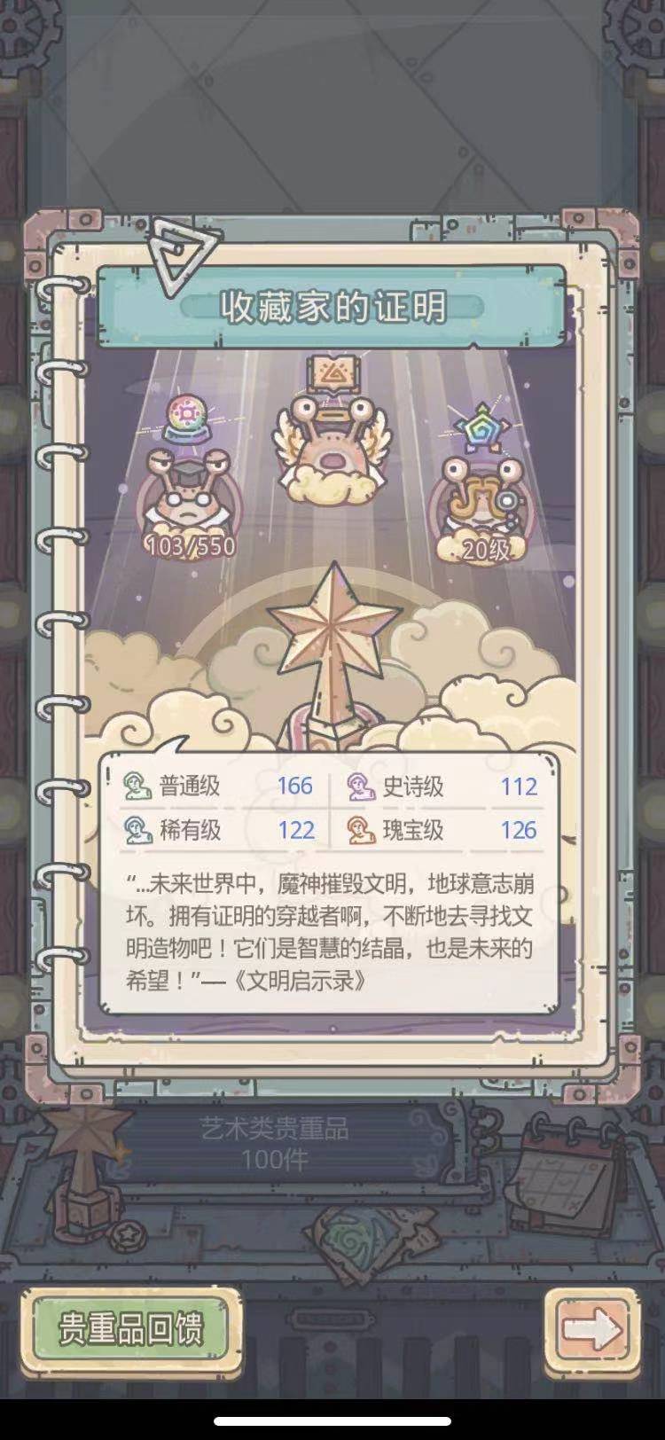 这里重点说一下贵重点,每个贵重品对应着现实中的重要文物或成就,把他们分为五大类(文化、科技、信仰、人气、机械),每个贵重品有这五个维度的数值,贵重品有五个等级(绿、蓝、紫、橙、SSS橙),好的贵重品五维高一些,所有贵重品的五维之和就是蜗牛的五维,可以转换为战力,贵重品最有意思的是里面的文字介绍,听说有一百万字,能学习到不少知识。