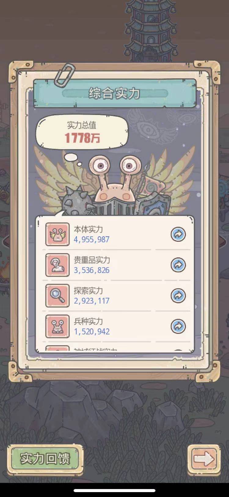 传统游戏都是杀怪、拿经验、升级,然后等级高了打BOSS掉装备后升级、锻造、升星、镶嵌、符文、洗炼等等花哨的玩意,就为了强行拉长游戏生命,吸引玩家氪金。这款游戏不是这样,蜗牛的战力由五部分组成,本体实力(基因、装备、属性等)、贵重点(类似卡片收集)、探索(类似开地图百分比)、兵种(类似三国的士兵数量)、神域(剧情)、任务(主线+支线)。所以像一般的RPG那种无脑刷和大量时间肝都没什么用,真正意义上做到佛系。