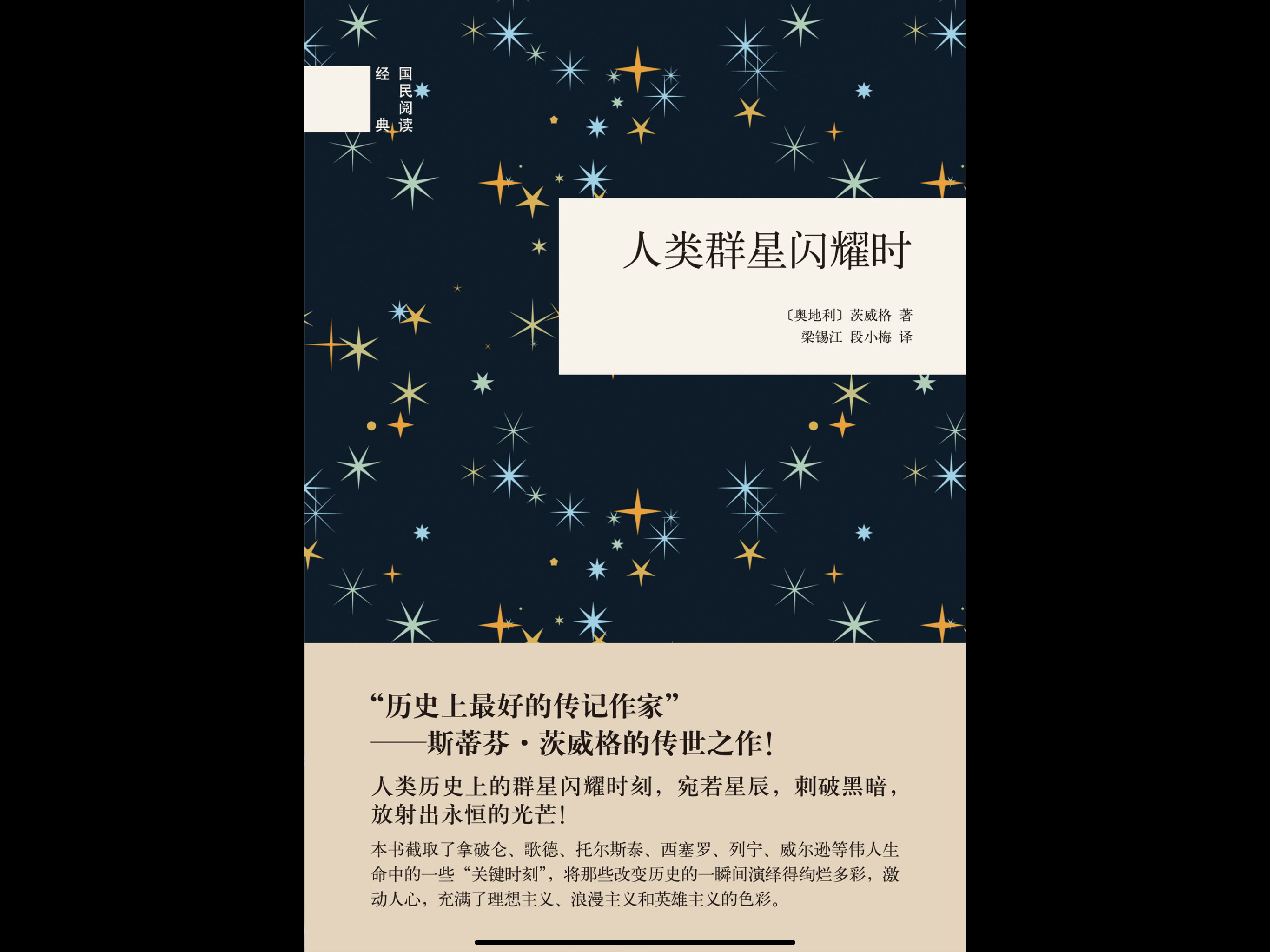 本书的内容在人类群星闪耀时的百度百科已有详细介绍,内容精炼、注解清晰,是非常好的导读材料,这里就不再复述,仅把14个故事按时间和题材顺序罗列如下,其中括内内为旧版标题,旧版的翻译更直白易懂,新版(中华书局)翻译更有意境,并为每篇故事加入导读与注释,把原本17万字的小说扩展为30万字。