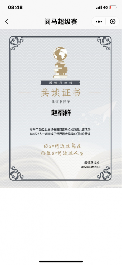 每年都会有一场阅马活动,一天读一本书,完成答题通过后试为完赛。之前几年是线下办的,我参加过一次,当时读的书是《寻找宜居行星》,今年选的书是《鼠疫》,很符合现在的大环境,大家有兴趣可以在微信小程序搜索 “阅读马拉松”关键字,平时会常推荐与书相关的活动和知识,比如推荐书单、名人领读等。